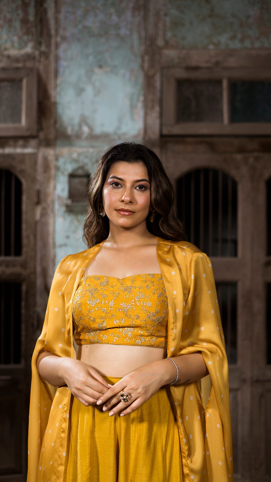 Yellow Slub silk machine embroidered bustier with Solid yellow silk satin palazzo paired with Bandhani organza satin cape